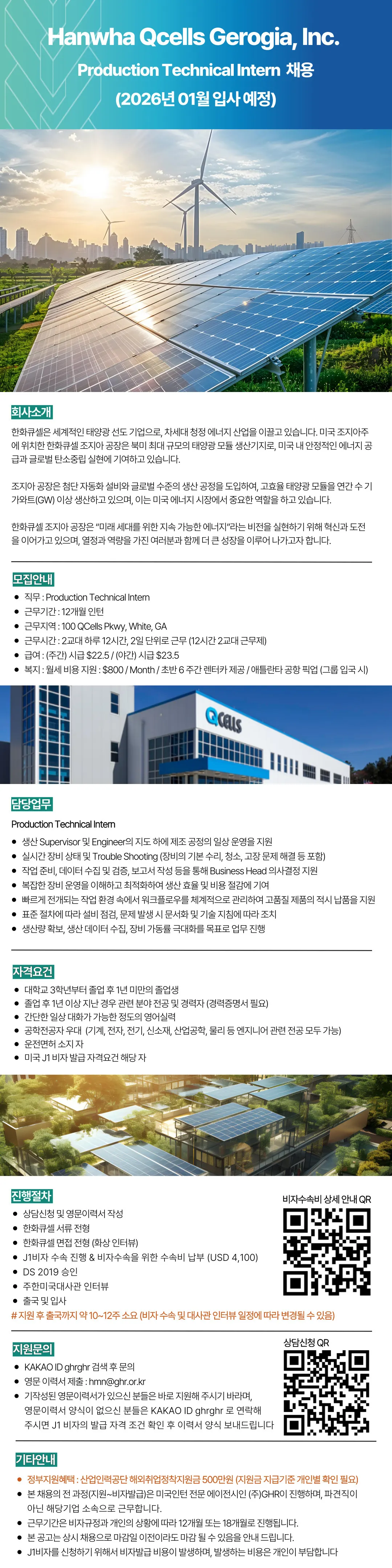 한화큐셀 미국 조지아 법인에서 국내 최대 규모 수준의 J1 인턴 채용(30명 이상) 을 진행합니다.