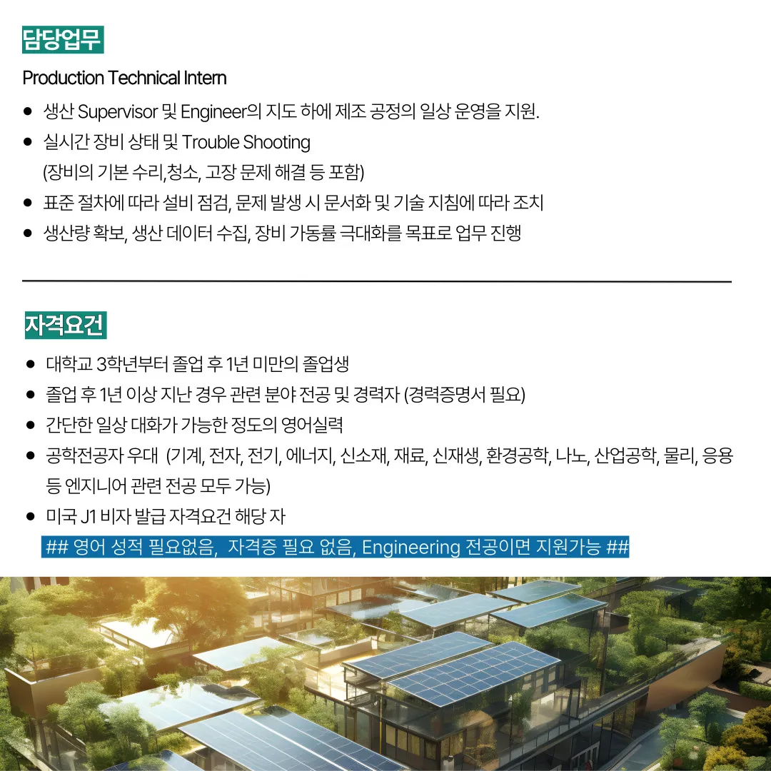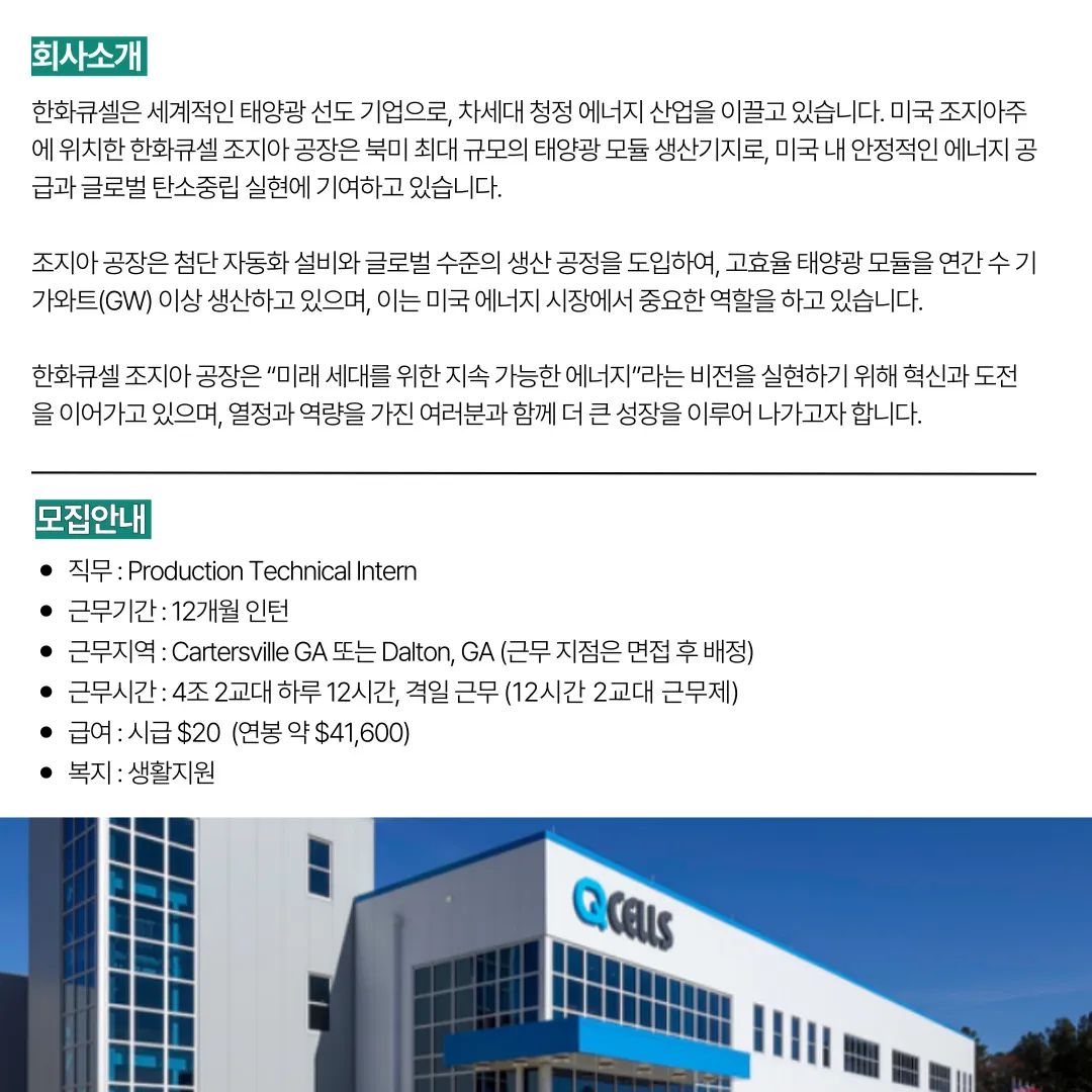 Hanwha Qcells Georgia, Inc. Production Technical Intern 채용 (2026년 05~07월 입사 예정)