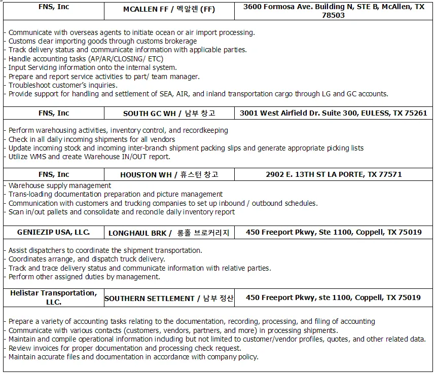 북미 항공, 해운 수출입 물동량 업계 1위 종합 물류 대기업으로, 여러 개의 자회사로 운영 중이며, 항공, 해운, 육상 물류를 비롯하여 세관업무 등 각종 관련 업무를 담당하고 있습니다. LX판토스, LG 그룹사 물류를 전문으로 하는 물류기업입니다. 전사 임직원 약 1,000여명이 근무 중이며, 매출 규모는 약 $81억 달러입니다.