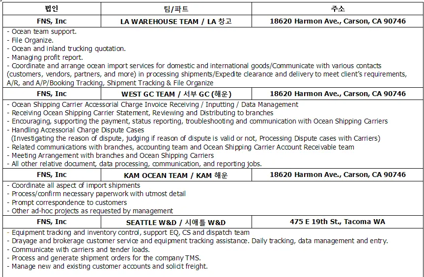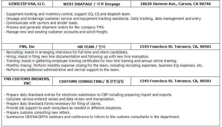 LA 근교에 위치한 국제운송, 수입통관, 트럭킹 운송 그리고 창고 보관업을 운영하고 있는 종합 물류 회사입니다. 규모가 크지는 않지만, 2004 년설립이후 꾸준히 성장하고 있으며, 안정적으로 유지되고 있습니다.