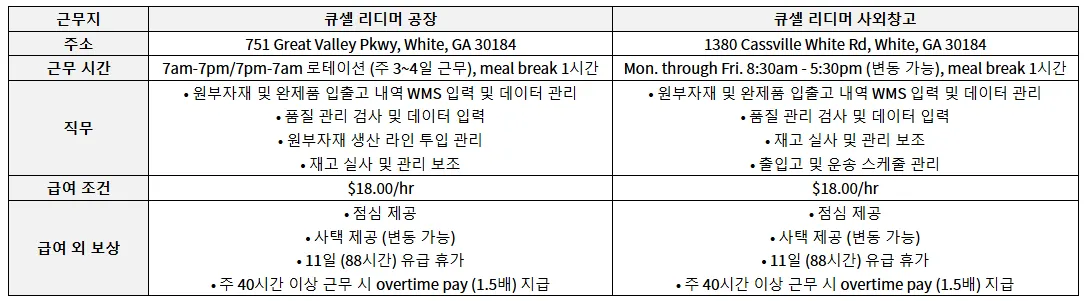 6개월 만기 근무 $250/ 1년 만기 근무 $500 보너스 지원 (회사 내부 사정에 따라 변동 가능)